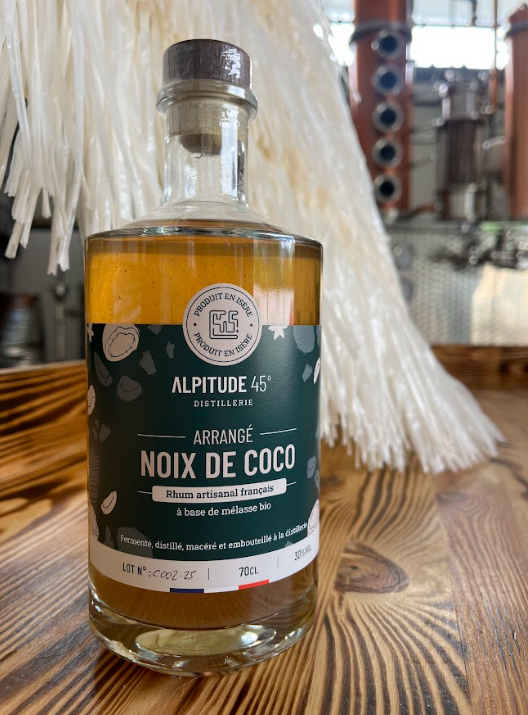 Notre arrangé à la noix de coco est élaboré à partir du rhum blanc Alpitude 45 et de véritable chair de noix de coco.