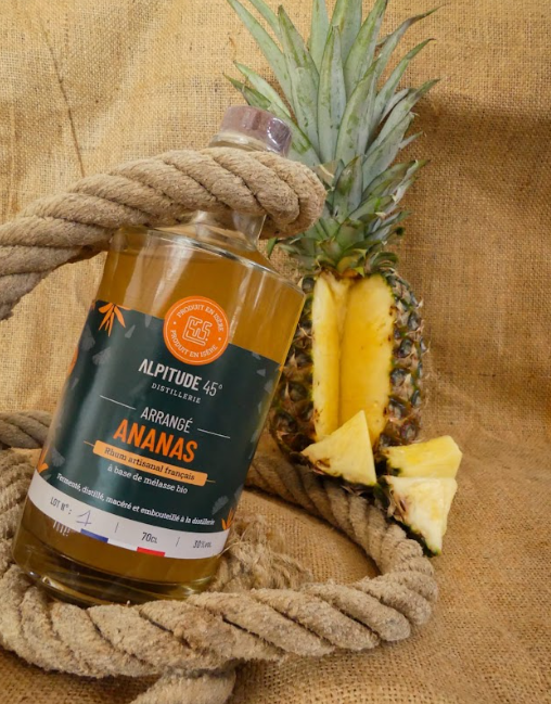 Notre arrangé à l’ananas est élaboré à partir du rhum blanc Alpitude 45 et d’ananas frais.